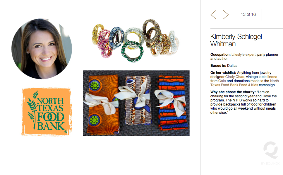 I loved being a part of the Q by Equinox blog with my holiday wish list. It was a fun opportunity to share some of my favorite things: Jewels by Cindy Chao, Linens by GAIA, and the North Texas Food Bank Food 4 Kids Campaign that I am co-chairing for the second year.