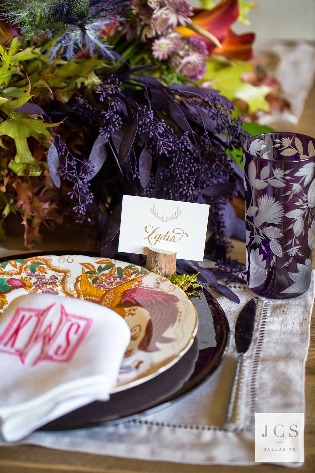 Etched Glassware / Monogrammed Napkins from Lettermade / Tartan Tablecloth from Ronda Carman Fine Fabrics / Similar to Tartan Tablecloth / Place Card Holders and Place Cards / Calligraphy by Halo Calligraphy / Antlers in Flowers / Antler Table / Nest Candles / Antler Oval Platter / Tartan Glassware – not shown but would look great! / Royal Crown Derby Old Avesbury China