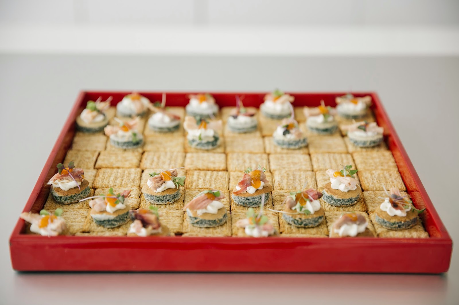 | A simple touch to add to our game night theme: we arranged crackers in alternating directions on our tray to make a checkerboard pattern. |