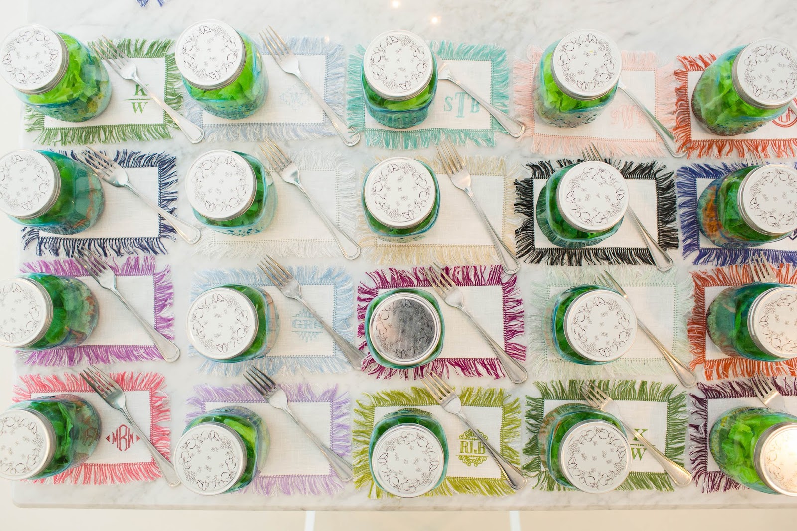Looking for the perfect way to feed your guests at the next baby or bridal shower? The darling Mary Love Koons has the answer! At the media preview lunch that John Cain Sargent hosted for Monograms for the Home last week, Mary Love created the most delicious salads you can imagine! Of course, we served them with a selection of my new Halo Home by KSW linen foldover napkins.