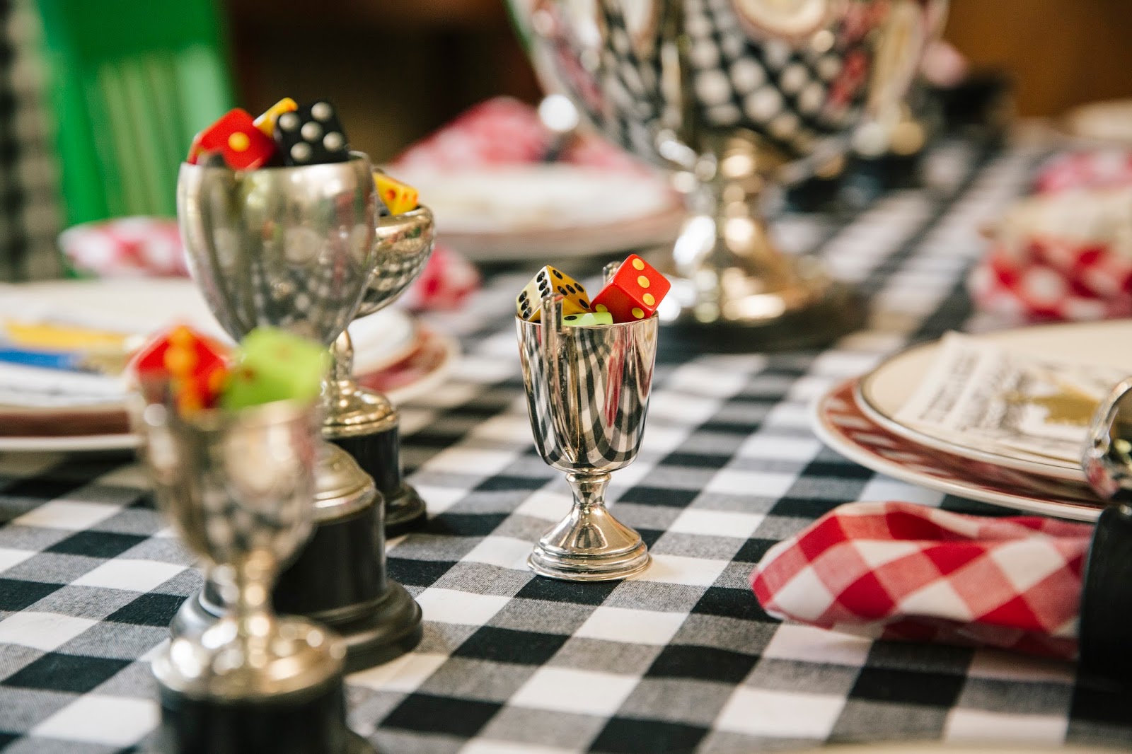 I pulled a collection of trophy cups off of the shelves and filled them with vintage ribbon candies and colorful dice so that the children could play without making a big mess.