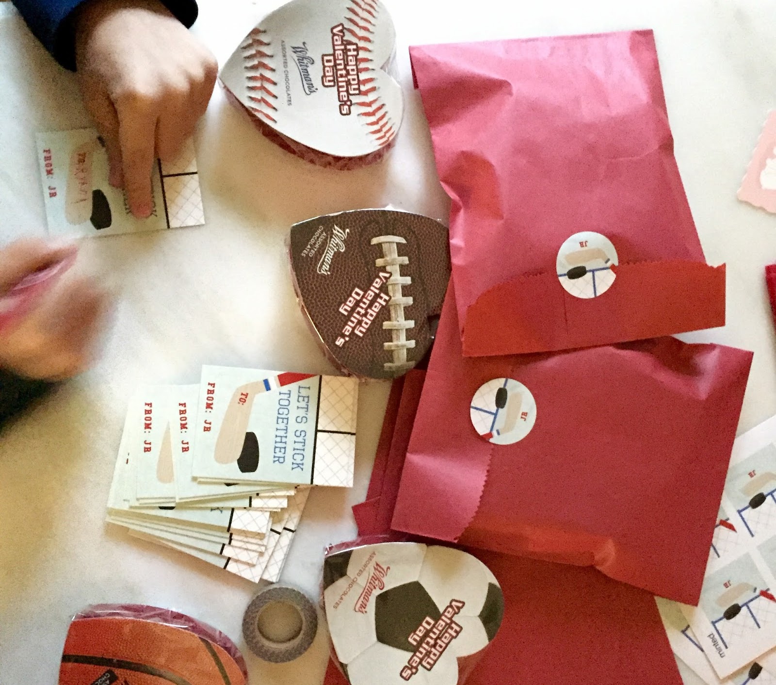 Speaking of JR, he could not contain his joy when we searched for “hockey Valentines” and he found this one! He is seriously obsessed with his “Let’s stick together” cards because he was able to put his favorite photo with a few of the Dallas Stars hockey players on the back of it! He found some co-ordinating stickers to personalize that will seal his red paper bags of Whitman’s Sports Theme Chocolates.